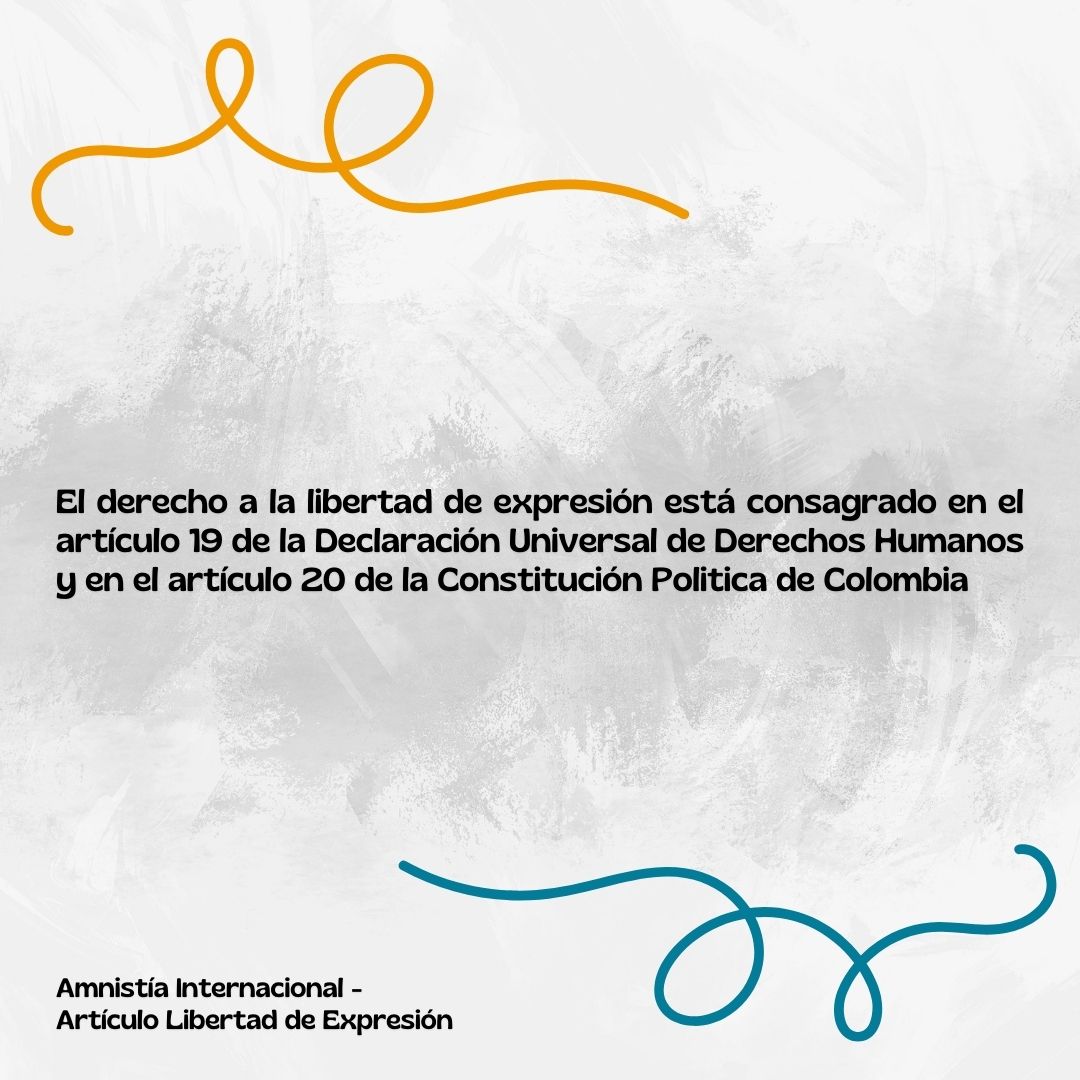 El derecho a la libertad de expresión está consagrado en el artículo 19 de la Declaración Universal de Derechos Humanos y en el artículo 20 de la Constitución Política de Colombia. La defensa de este concepto ha sido siempre parte esencial del trabajo de Amnistía Internacional y es imprescindible para la rendición de cuentas de quienes ejercen el poder. Además, está estrechamente vinculado a otros derechos humanos, como la libertad de pensamiento, conciencia y religión, que sin ella no podrían realizarse plenamente.